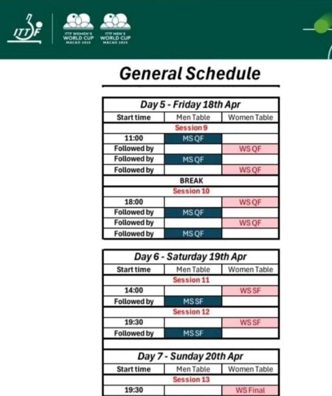 赛程表的电子脉冲在3月18日准时跳动:从4月14日小组赛首轮的双线作战,到20日决赛夜的终极对决,128场激斗被精密编排进7个昼夜。每日9:30的晨光对决与17:00的暮色厮杀,将澳门这座赌城幻化成24小时不停转的乒乓轮盘。值得玩味的是,决赛夜打破惯例的女单先行模式——这或许暗示着国际乒联对新生代女将的力捧,又像是对孙颖莎、王曼昱这对"双生花"的隐秘致敬。