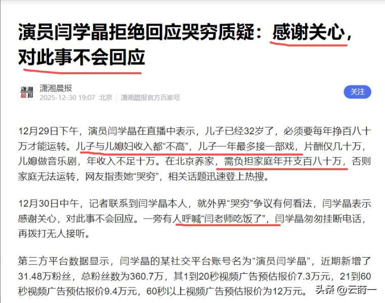 “一年挣几十万不够花”!国民演员闫学晶直播中一句“哭穷”,瞬间点燃网友情绪。