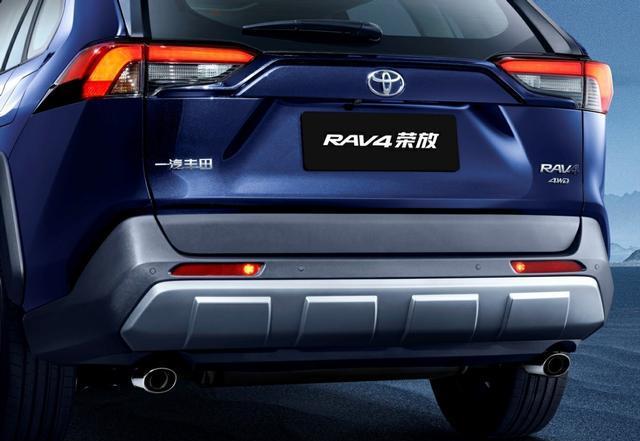 RAV4荣放车身尾部,尾灯由银色饰条相连,为常见设计。尾门规整,后保险杠融合黑色磨砂与银色饰板,叠加设计彰显野性。