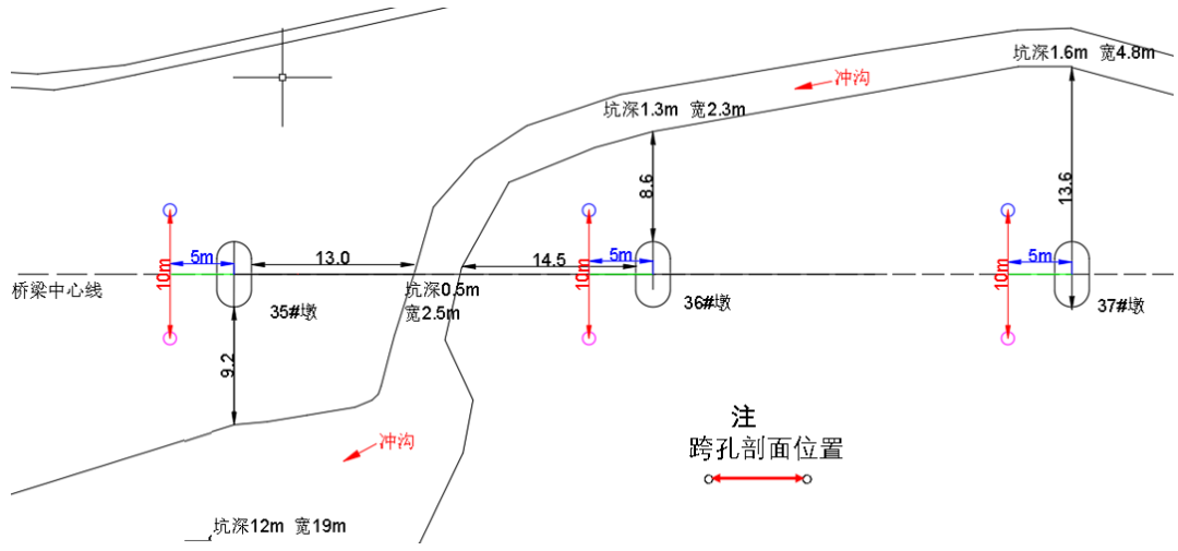 某大桥位于常年受雨水冲刷的区域,35#、36#、37。汛期过后,墩旁黄土被水流刷走,出现 3~4m 高的新鲜冲沟——形成了明显的冲沟。这种地质变化可能引起墩体周围土体松动、空洞甚至塌陷,严重影响桥梁结构的稳定性和通车安全。