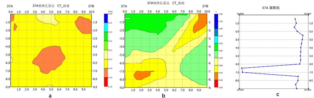 37#墩:冲沟南侧13.6m,波速在0.12–0.14 m/ns之间,趋肤深度略低,局部区域粘土含量稍高,但整体仍属密实稳定土层,未发现空洞或含水带。7m 深处阻抗突然掉到 110 Ω,现场复测发现是一截废弃钢管,与结构安全无关,不影响基础稳定性。