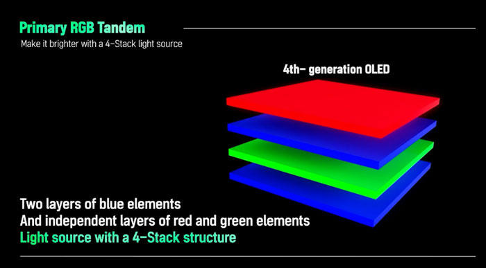 Tandem结构,是指将实现显示屏的各个元件以串联方式连接起来。而Primary RGB Tandem结构,则是将光的基本颜色——红色(R)、绿色(G)、蓝色(B)元件独立堆叠,使它们各自发光。在传统第三代OLED中,其结构共包含三层:其中两层负责蓝色,一层负责红色和绿色。而在第四代OLED中,最大的区别是将原本在同一层的红色和绿色分别独立成层,形成总共四层的结构。