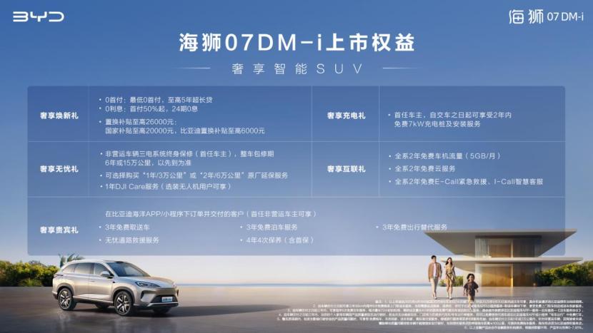 即日起,订购海狮07DM-i的用户可享奢享焕新礼、奢享充电礼、奢享无忧礼、奢享互联礼及奢享贵宾礼五大购车好礼,涵盖0首付0利息、至高26000元置换补贴、3年免费取送车、3年免费泊车服务、3年免费出行替代服务等多重购车权益。