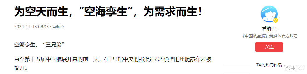 信息来源:看航空 2024-11-13 为空天而生,“空海李生”,为需求而生!