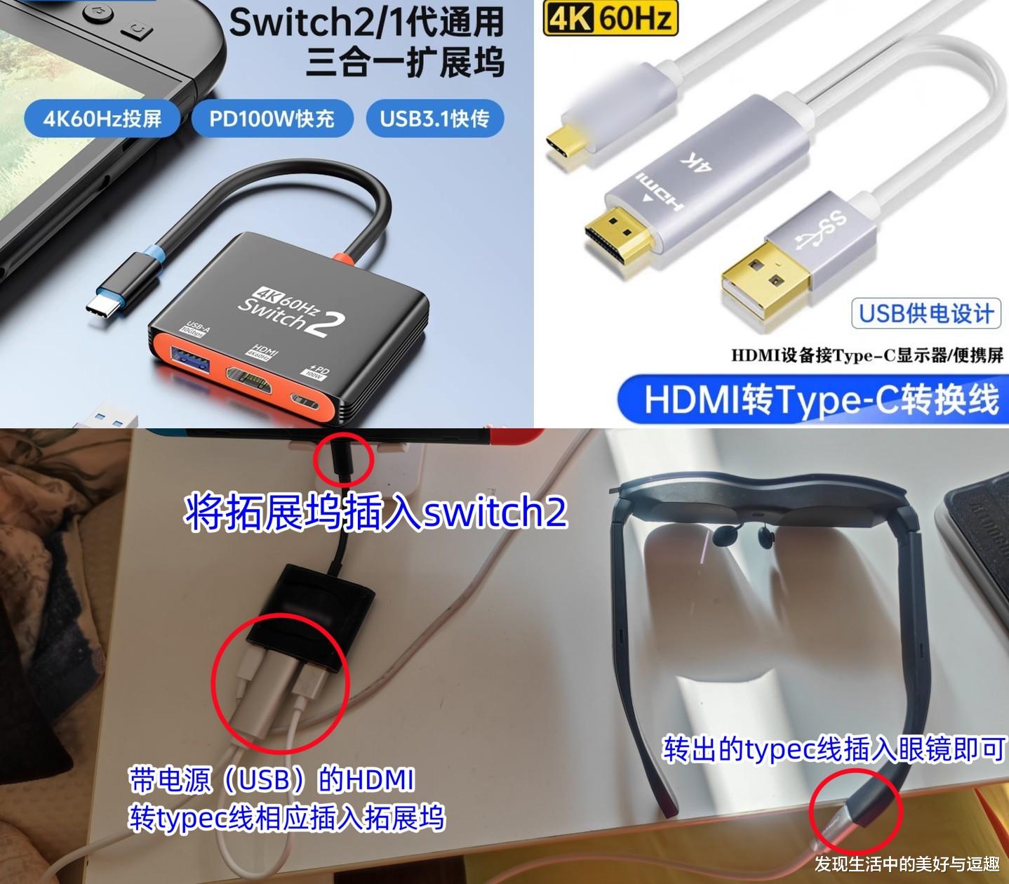 最后有个小技巧,大家可以购买类似同厂家这种规格支持ns2的拓展坞,(下图上左)它可以直接HDMI输出,并夕夕可以做到44左右,价格相当于上面那款不到一半的价格。适合只输出电视的玩家。它也可以套娃方式连接眼镜,前提是你得有HDMI转C口带电源的线。