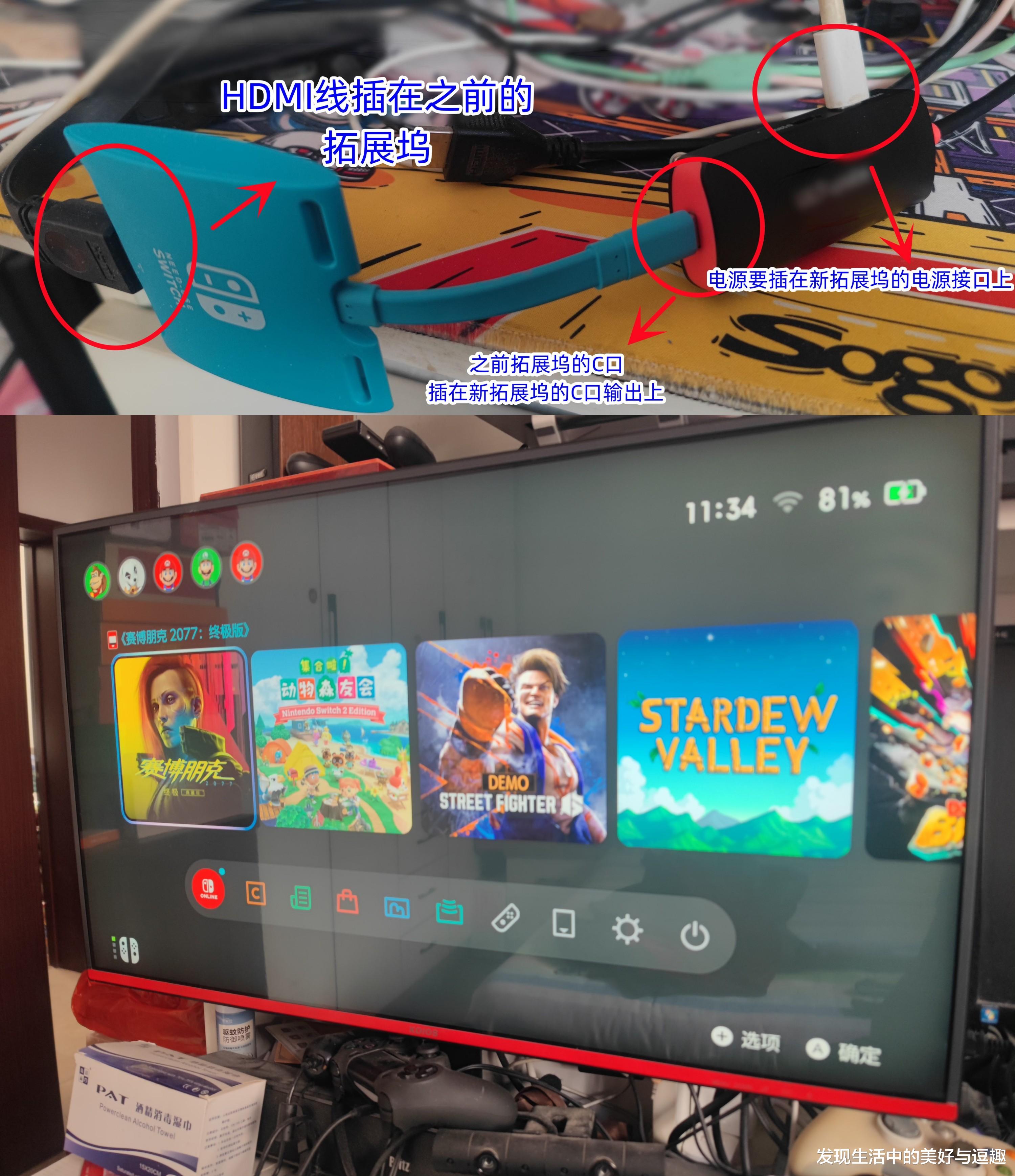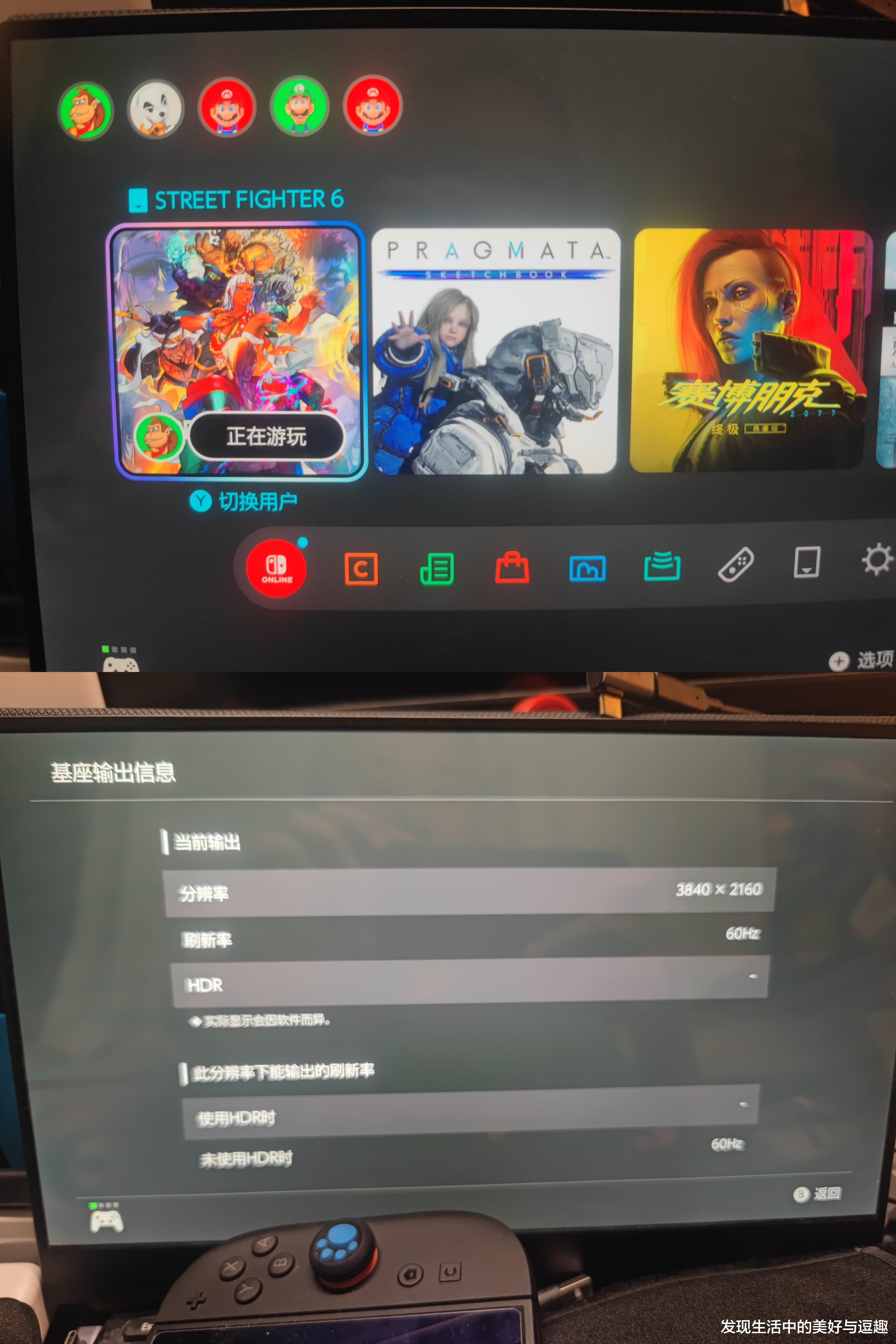 2、我有两个32寸的台式4k显示器,一个便携4k显示器,也都支持hdr,有一台支持4k 120hz,并且支持一线通C口视频输入及65w反向充电。本来它可以一线插Switch1代都不用插电源的,2代因为特殊协议就只能用这个拓展坞了。但是,C口用这个拓展坞貌似只能支持1080p,不支持120hz。如果是4k就变成了蓝色基底浅色发白的效果,不知道怎么回事儿(由于这台显示器HDMI2.1的接口被ps5和xsx占上了,我本身买这个拓展坞也只是为了接AR眼镜,就懒得测试了)