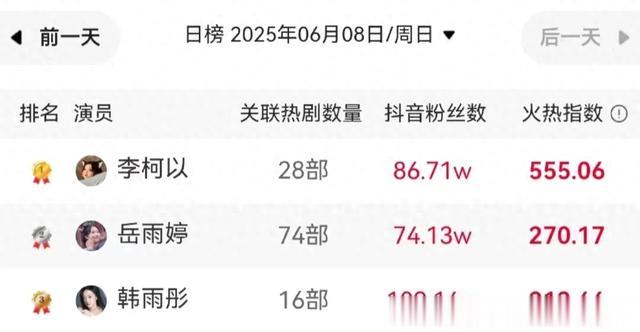 看过了最新女演员热度榜直接惊掉下巴!第一名又换人了是李柯以,厉害了!从11名杀到第3名再登顶,什么黑马逆袭剧本!