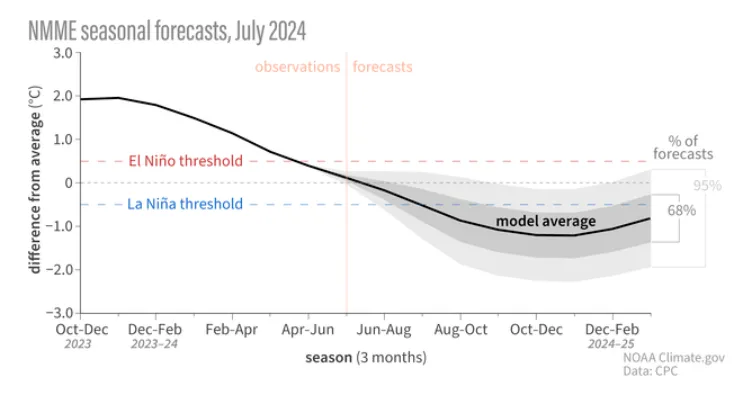 而7月还是过渡期,但是拉尼娜现象的呈现已经明显,根据NOAA发布的新一轮数据显示,预计今年拉尼娜现象在11 月至 1 月发生的可能性为 79%,而在8 月至 10 月期间出现拉尼娜现象的概率为 70%。