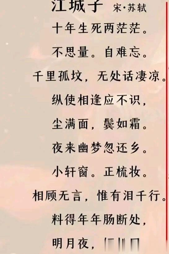 在王弗逝去10年后,有一晚,苏轼梦到自己回家乡了,见到妻子王弗了,梦中,夫妻相见垂泪。
