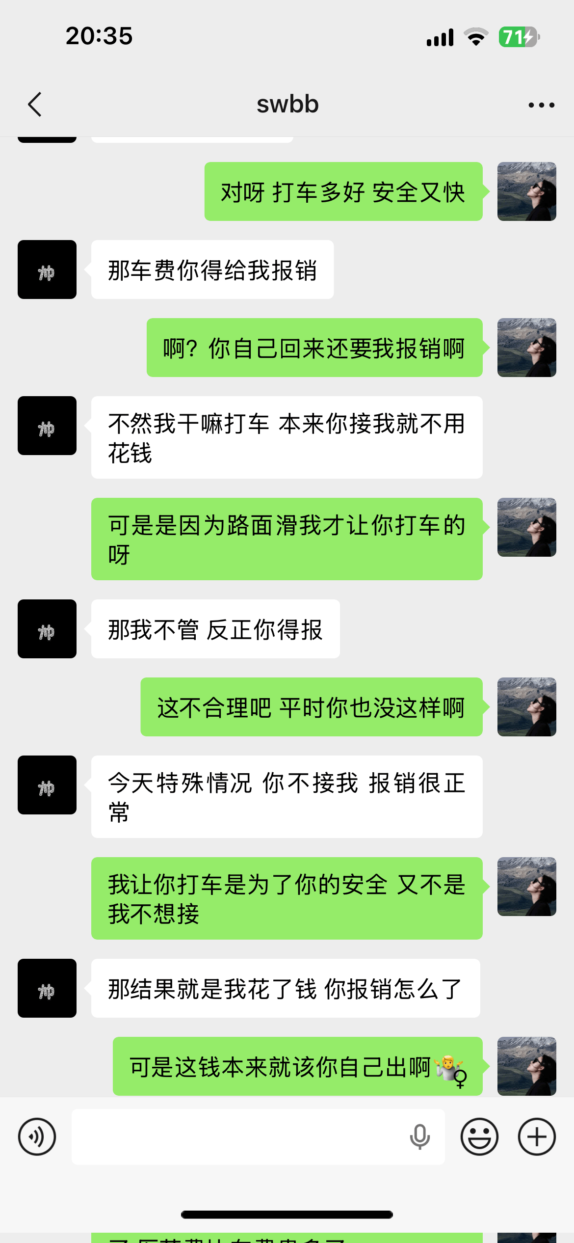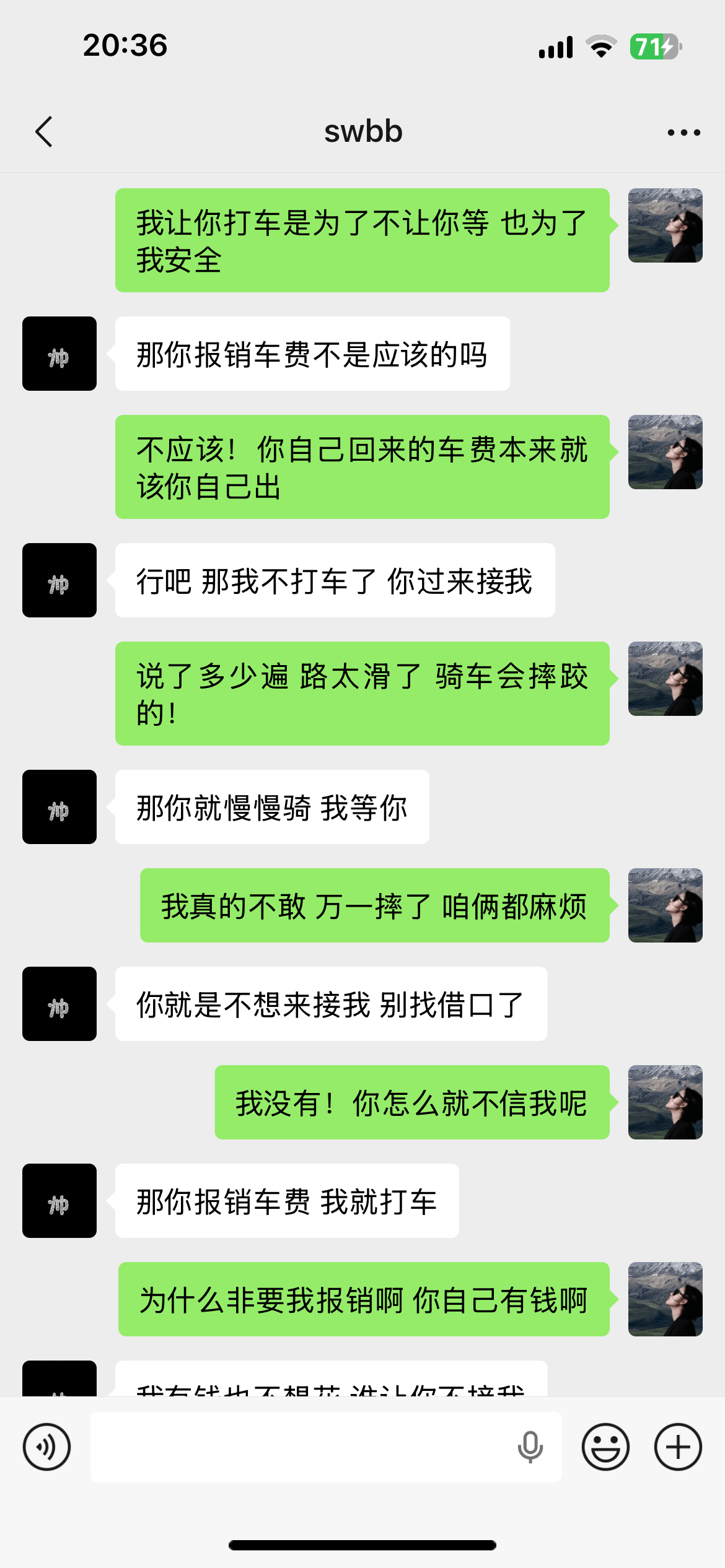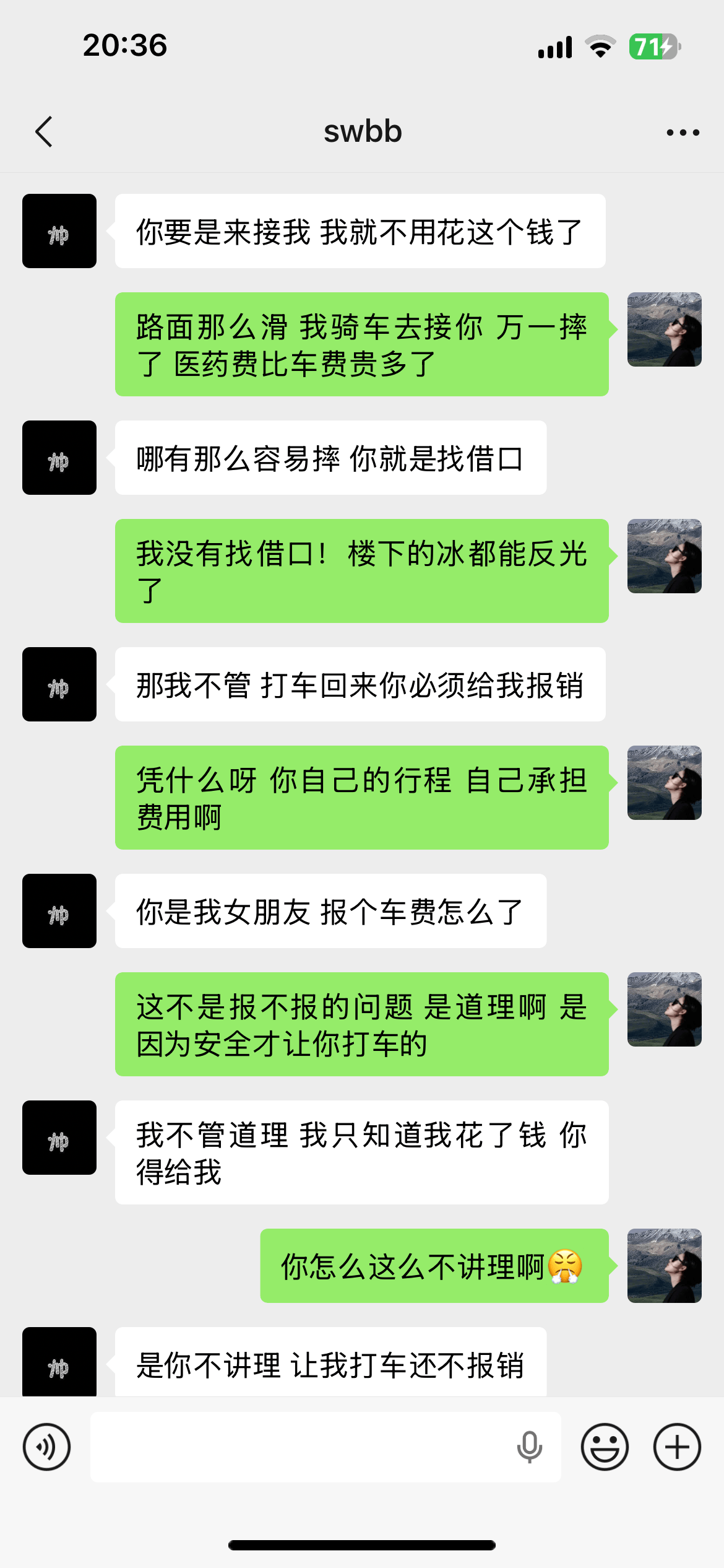 我觉得为了安全让他打车,车费该他自己出,他却蛮不讲理,说我不接他就该报销,还拿心疼不心疼绑架我。争执了半天,他要么逼我冒险骑车,要么逼我报车费,最后实在吵得累了,我只能妥协报销,真的太气人了,就不能体谅下路面危险吗?