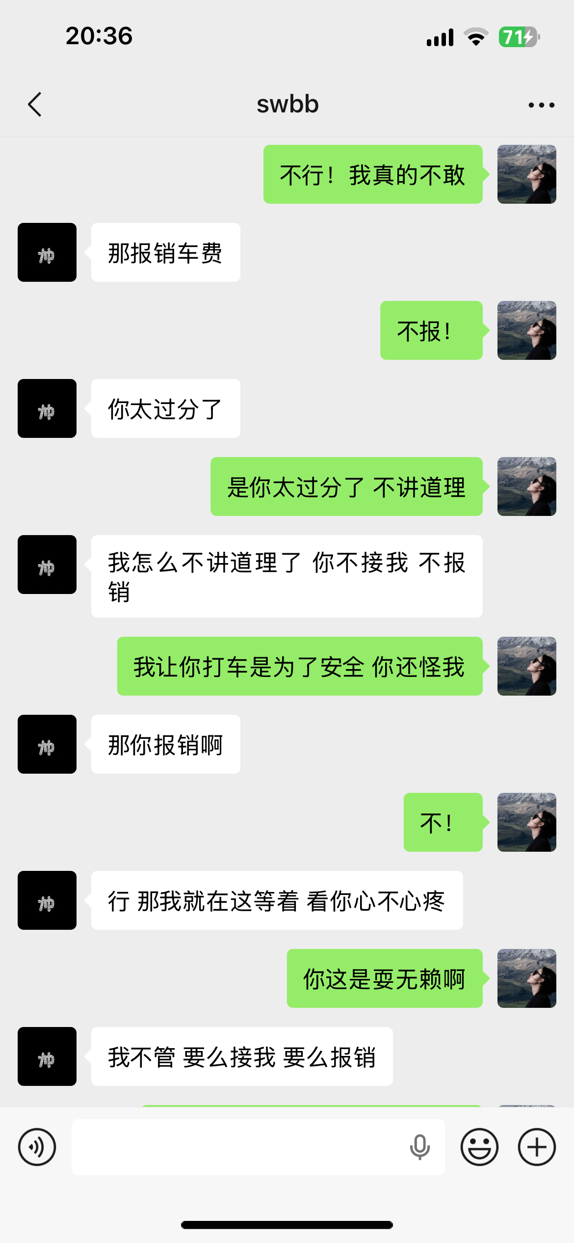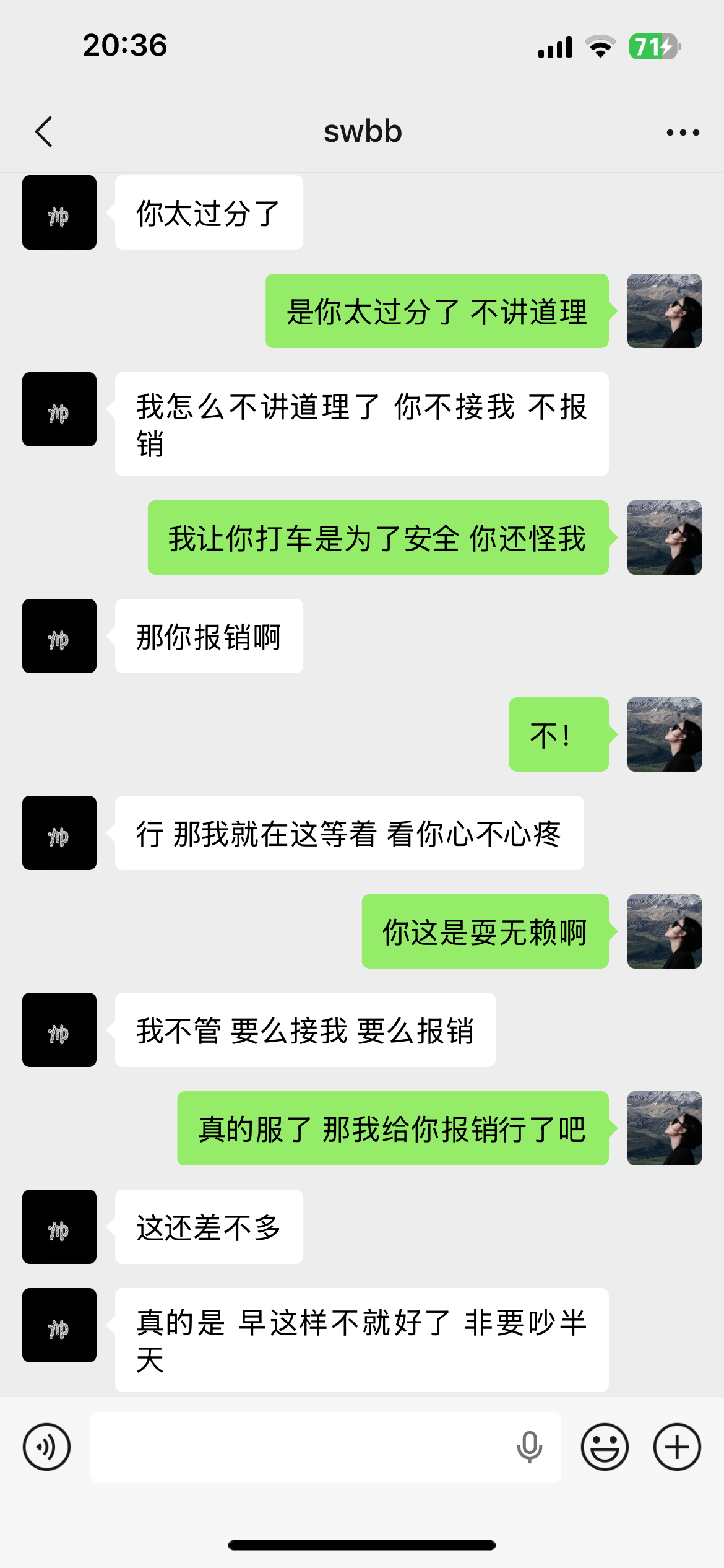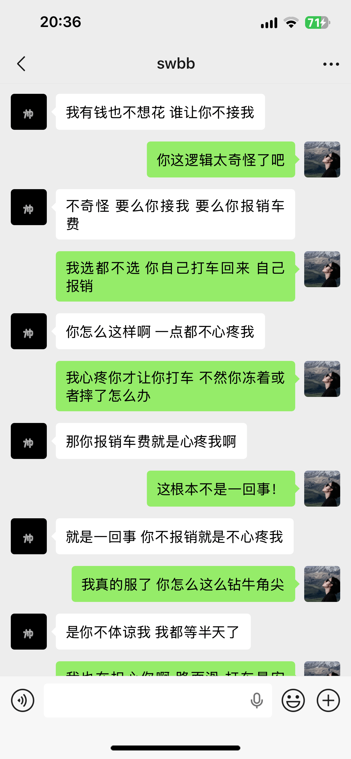 我觉得为了安全让他打车,车费该他自己出,他却蛮不讲理,说我不接他就该报销,还拿心疼不心疼绑架我。争执了半天,他要么逼我冒险骑车,要么逼我报车费,最后实在吵得累了,我只能妥协报销,真的太气人了,就不能体谅下路面危险吗?