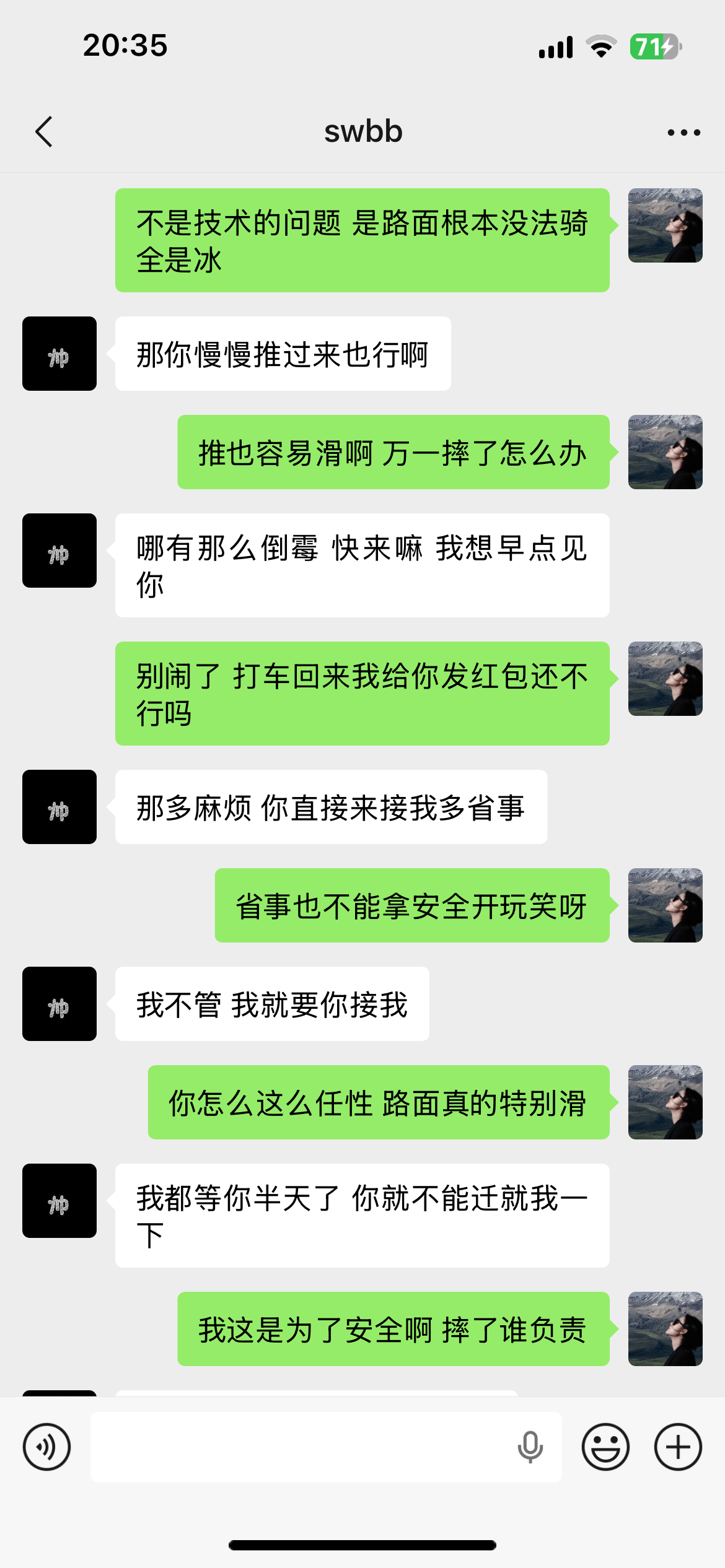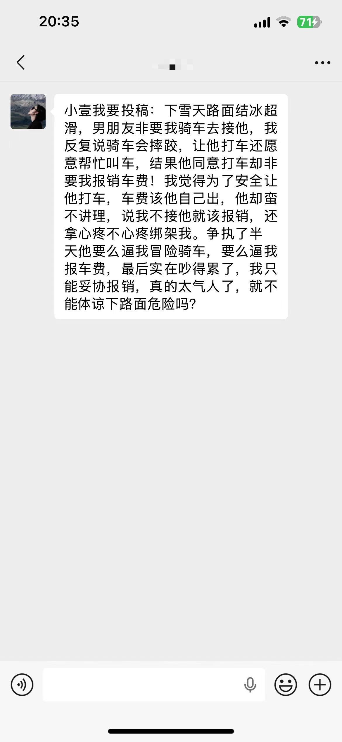 下雪天路面结冰超滑,男朋友非要我骑车去接他,我反复说骑车会摔跤,让他打车还愿意帮忙叫车,结果他同意打车却非要我报销车费!