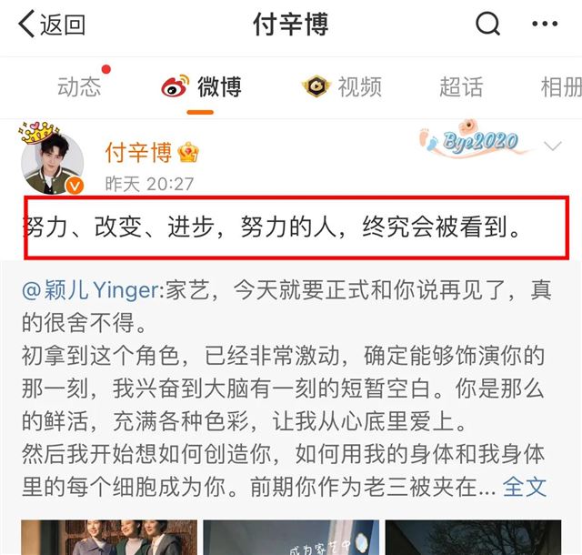 她的老公付辛博立刻转发了这条动态,评论道“努力、改变、进步,努力的人,终究会被看到”。