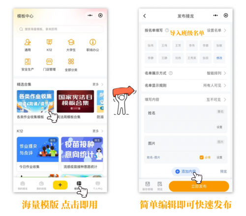 现在李老师只需在接龙管家先选择对应的模版,设置好填写内容,就可一键转发到家长群,家长点击群链接就能参与填写,不用担心班级群刷屏;