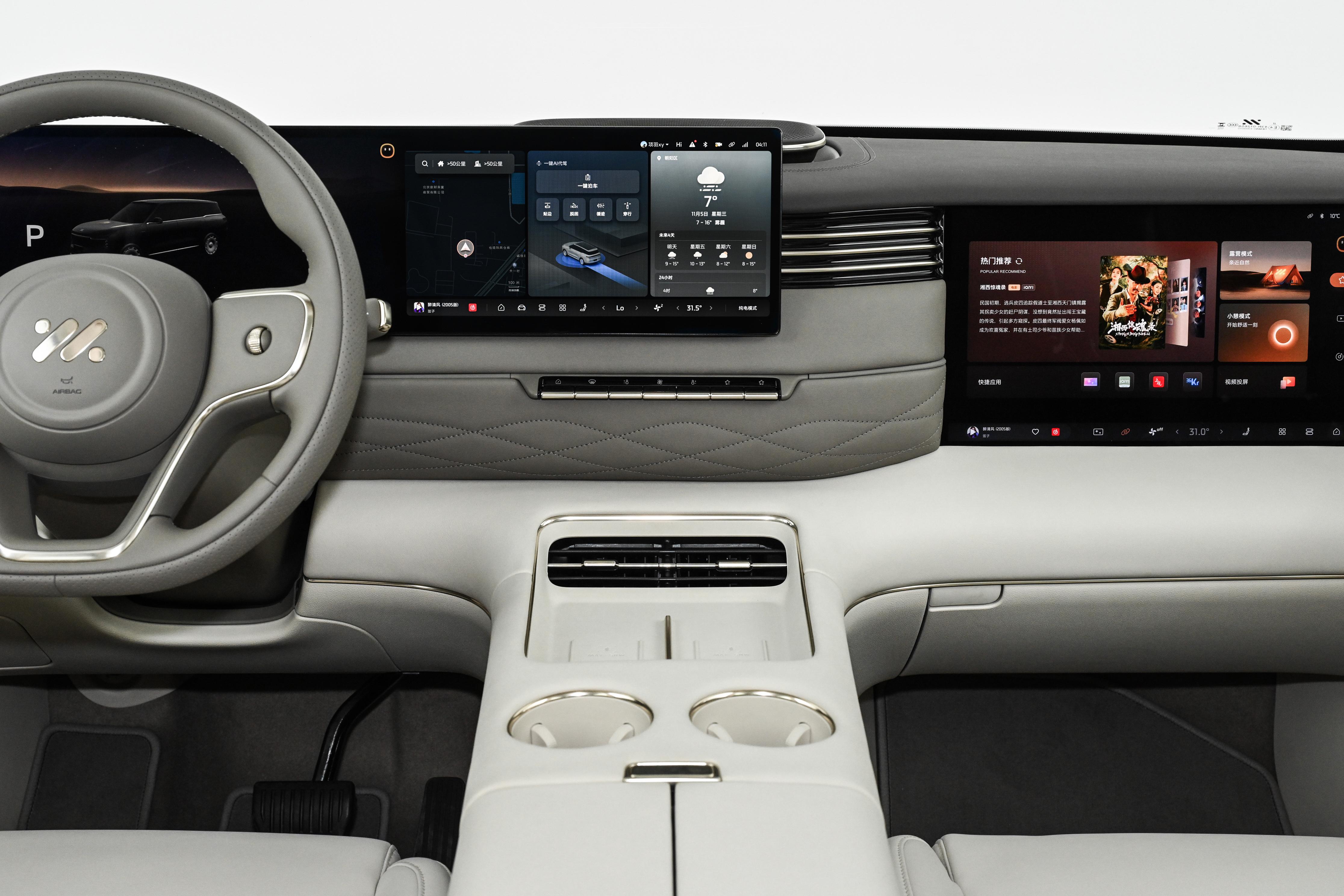 车内的豪华配置也让人眼前一亮。它采用了深灰与白色碰撞的内饰主题,搭配多处镀铬元素,简约又高级。中控区域有27.1英寸5K MiniLED中控双联屏与15.6英寸3K MiniLED副驾娱乐屏,这两个屏幕的分辨率和色彩表现都是行业内非常不错的。你可以在上面查看各种信息、看电影、玩游戏,娱乐功能非常丰富。