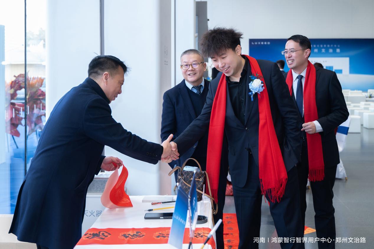 紧接着在热烈掌声中,鸿蒙智行智界用户中心·文治路店总经理赵恒、鸿蒙智行享界用户中心·文治路店总经理马丹,共同登台揭晓博行汽车集团精心准备的一幅题为“豫见鸿蒙,智启行远”的祝福卷轴。