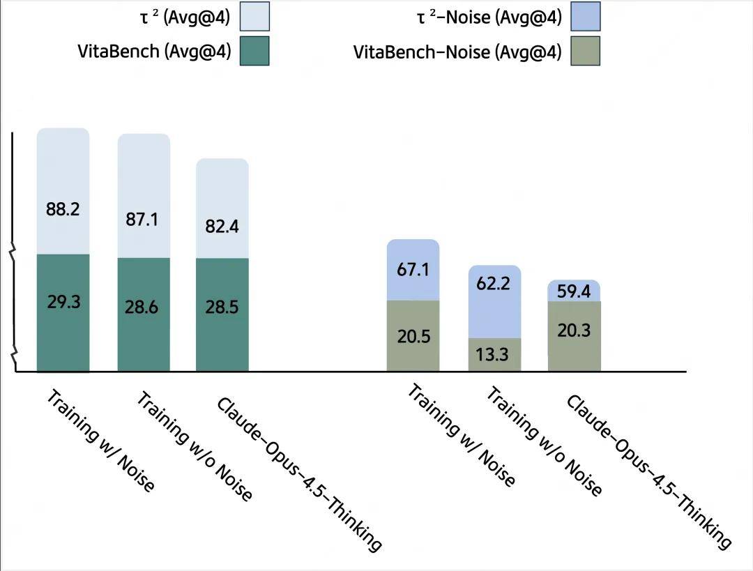 下图展示了模型是否采取面向噪声环境的稳健训练,在带噪声 / 无噪声评测集下的表现对比,其中不同的评测集上依据特性添加了不同类型的噪声。可以看到,带噪声环境下未经过稳健训练的模型的表现会出现大幅衰减,Claude 也无法适应全部的噪声类型。而经过稳健训练后,LongCat-Flash-Thinking-2601(Training w/ Noise 组) 对环境的噪声和不确定性展现出了强大的适应能力,并在各类非理想条件下取得更优表现。