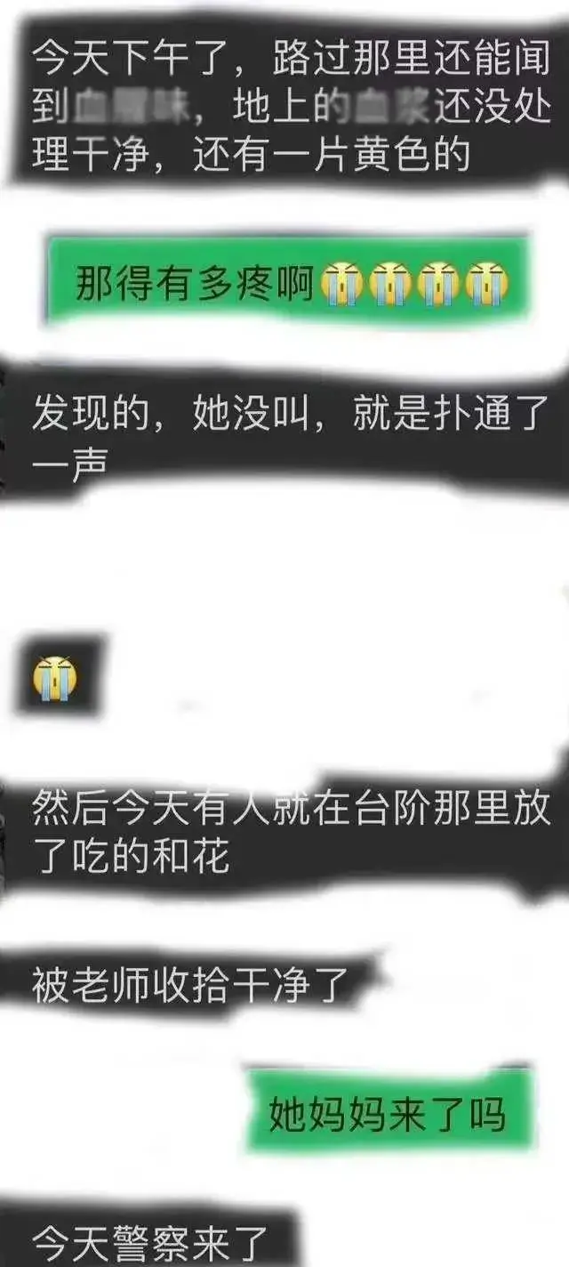 不过有同学说:这些祭品很快就被老师清理了,警察也来了,路过事发地还能闻到血腥味,地面上的血迹也没有完全被清理干净。