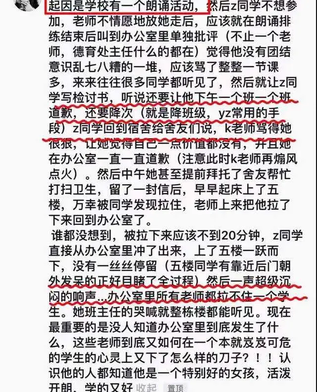 7 月 5 日,诸多网友于网上爆料:山西延安中学一名高一女生因难以承受老师的辱骂,悲愤地从教学楼 5 楼纵身跳下,当场殒命,众多同学亲眼目睹了这一惨状。而后,这个消息也是迅速的在网上传开了。