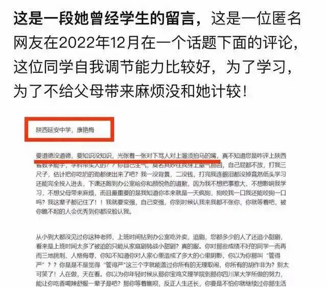 2022年12月,有同学指名道姓地说:陕西延安中学康艳梅,要道德没道德,要知识没知识,光有一张对下骂人,对上溜须怕马,的嘴。