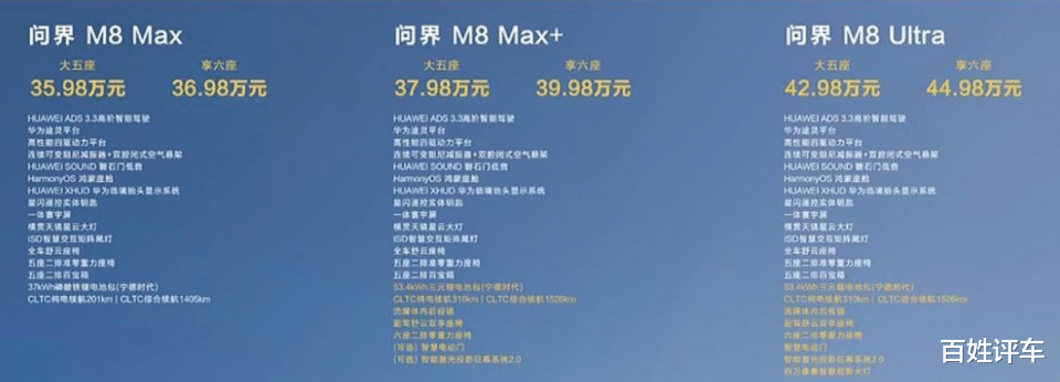 问界M8正式售价是35.98-44.98万元。全系增程,一共有Max、Max+、Ultra三个配置,每个配置又分为五座和六座版。三个配置的区别是,Max是37度电池,纯电续航201km;Max+电池53.4度电,纯电续航干到了310km,比M9的52度电还要长,配上了零重力座椅和流媒体内后视镜;Ultra版拉满,电动门、后排投影、激光大灯全安排上。