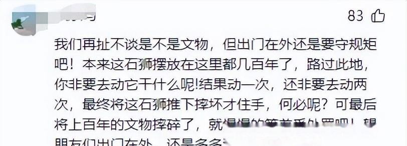 这不仅仅是一对石狮子的损坏,更是对中国传统文化的亵渎。 它们历经百年沧桑,身上留存着乾隆时期香客摩挲的痕迹,那是时间沉淀的印记,是历史的无声诉说。 如今,这些痕迹被粗暴地打断,600年的历史,被一瞬间的莽撞所摧毁,令人痛心疾首。 想想看,这些石狮子曾见证了多少朝代更迭,多少人事变迁,它们本身就是一部活生生的历史。