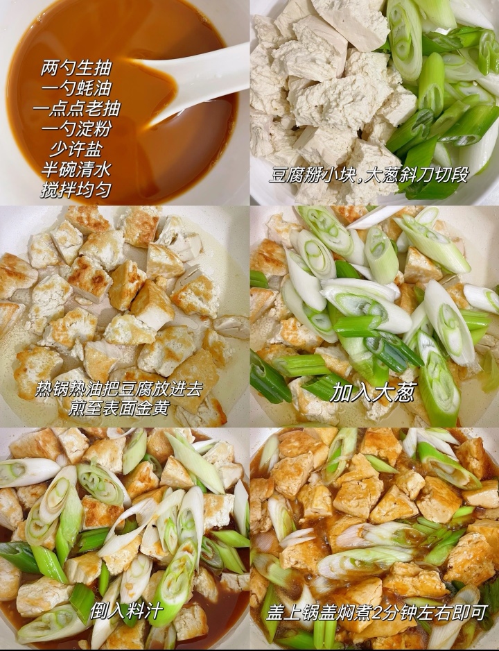 一盘色香味俱佳的葱烧豆腐就这样完成了。夹起一块,放入口中,外皮的微焦与内里的嫩滑完美融合,酱汁的咸鲜与大葱的清香在舌尖上跳跃,层次丰富,回味无穷。这道菜,无论是搭配一碗热气腾腾的白米饭,还是作为一道下酒小菜,都再合适不过。
