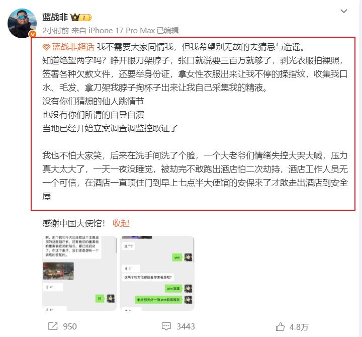 出门在外,安全最重要。12月9日,蓝战非再次发文表示不需要大家的同情,但希望大家别无故的去猜忌和造谣。随后,蓝战非还感谢了大使馆。