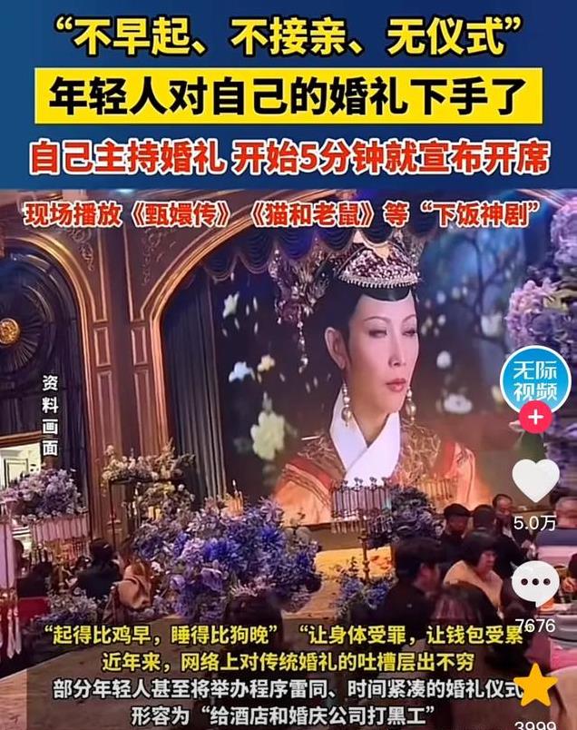 一时之间,无车队、无接亲、无主持的“三无甚至四无婚礼成为了年轻人们的“婚宴标配”。