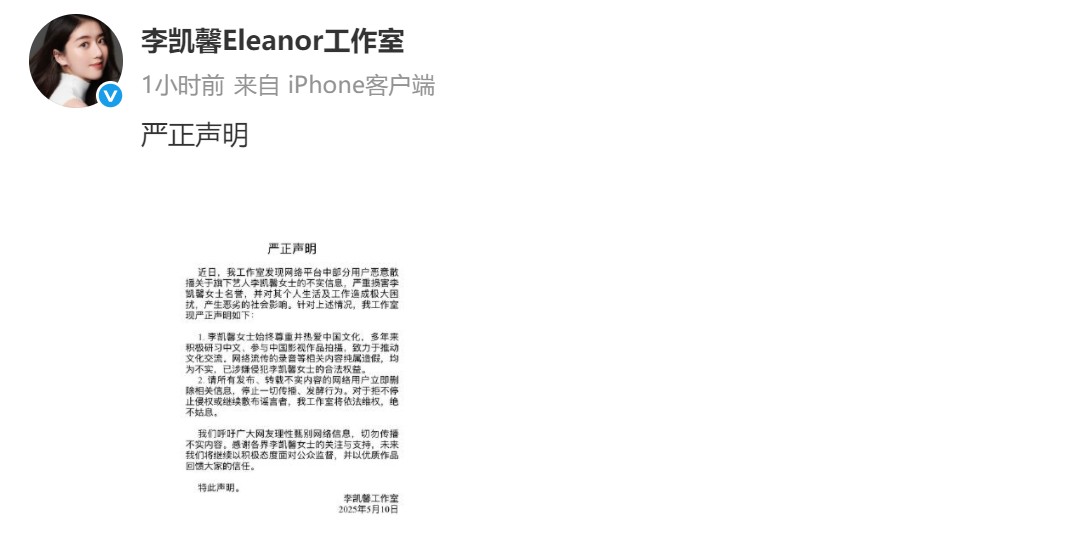 另外她还称自己出生在中国,16岁又再次回到中国,至今将近一半的人生都在中国度过,在这里得到了很多机会和帮助,也能在我喜欢的事业里发光发热,对于这片土地完全是热爱且充满感激的,在任何有关中国的立场问题上都绝不会产生动摇。