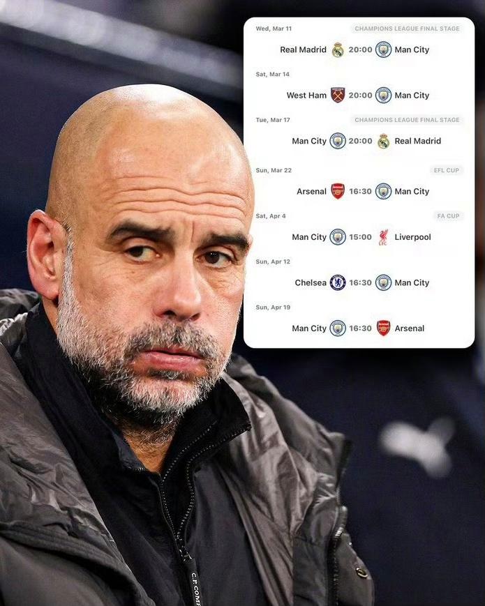 如果说联赛杯是开胃菜,那么随后的赛程才是真正的“正餐”。从3月下旬到4月中旬,曼城的赛程非但没有放松,反而更加恐怖。