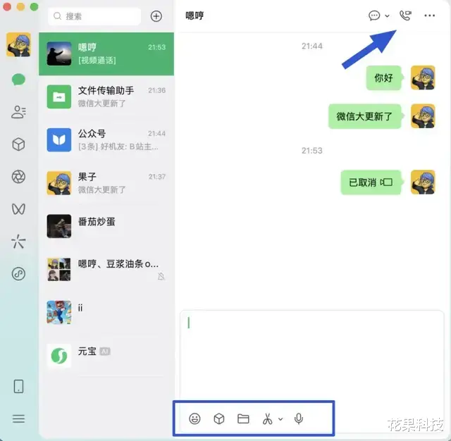 右侧的对话区域变化也很大,原本在输入框菜单栏右侧的语音和视频按钮改到了对话框右上角,并且整合在了一个按钮。