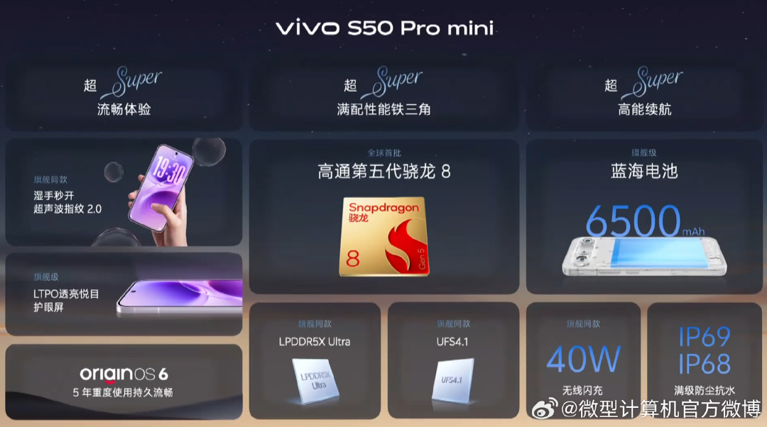 为保证强劲性能稳定释放,S50系列全系配备大面积高性能导热石墨与高效 VC 液冷散热,均热板面积最高达 4200mm²,在高负载运行时有效控制机身温度。续航方面,vivo S50 全系搭载 6500mAh 蓝海电池,在轻薄机身与长续航之间取得平衡;vivo S50 Pro mini 在小尺寸机身内同样塞入大电池,并支持 40W 无线闪充及无线反向充电,为无线补能和多设备协同提供更多选择。