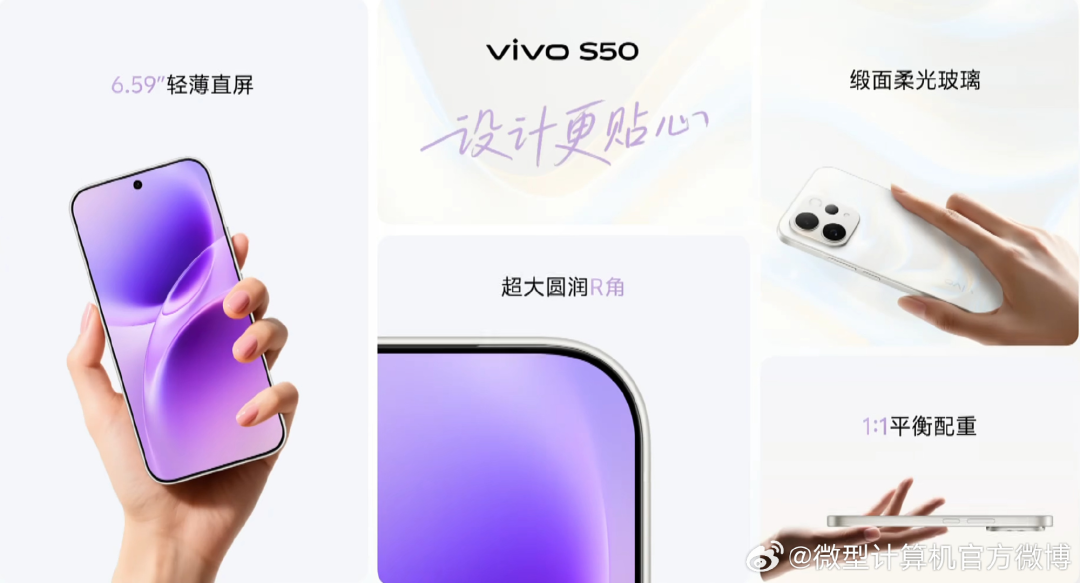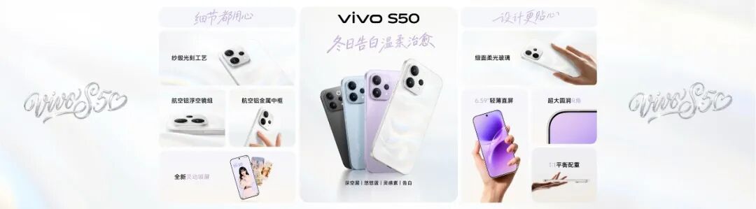 一眼心动:全新「告白」美学,颜值质感双在线全新的 vivo S50系列以色彩与工艺,进一步诠释“我喜欢我,每秒都生动”的态度。S50系列带来全新「告白」配色,在缎面柔光玻璃背板上引入全新纱缎光刻工艺,呈现白里透金的细腻光泽,观感更柔和、触感更温润且不易沾染指纹,如冬日暖阳般温柔治愈。仿佛将一份触手可及的温柔握在掌心,提醒我们在纷繁世界中,依然可以留出一份温柔,去拥抱那个独一无二的自己。在「告白」之外,vivo S50 还提供灵感紫、悠悠蓝、深空黑三种配色,vivo S50 Pro mini 精选告白、灵感紫、深空黑三款配色,覆盖从治愈浪漫到沉稳内敛的多彩选择。