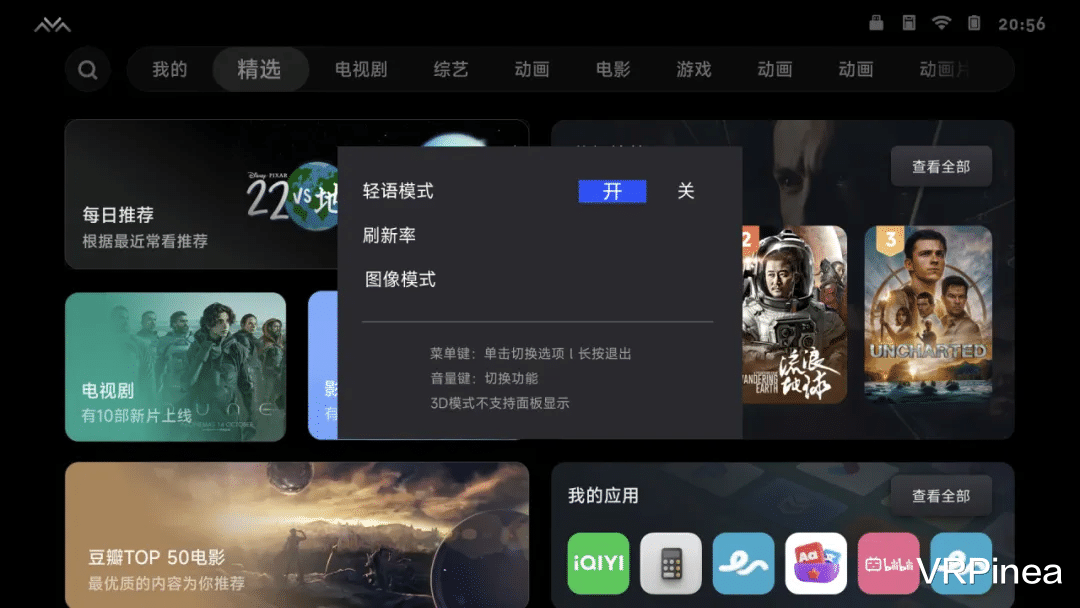 再比如,像我们手机上的实体按键,调节屏幕亮度、音量这些基础功能都是在应用之上的。我随时可以调出来使用。雷鸟Air 2s也做了类似功能,只要按一下实体键,直接调出包括轻语模式、3D模式、高低刷新率、色彩模式的调节选项。