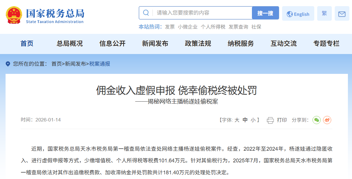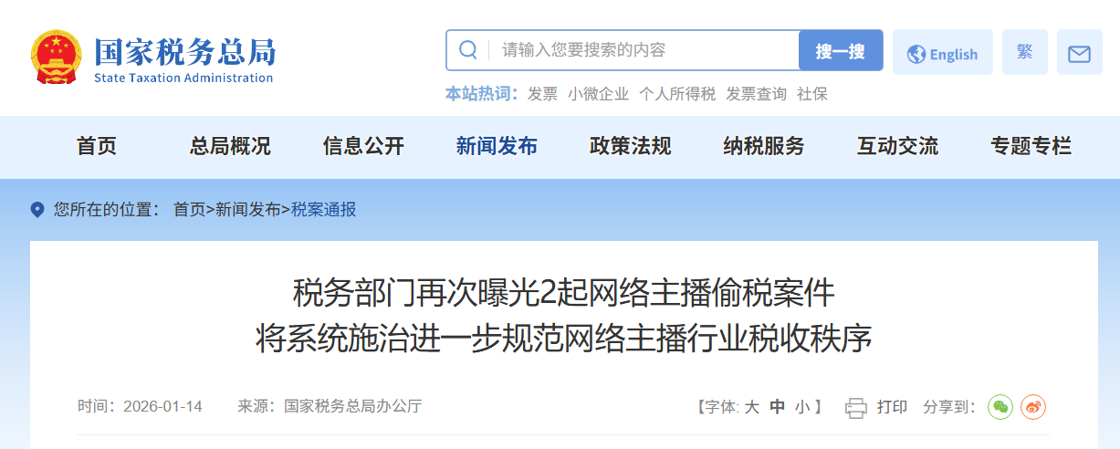 1月14日,国家税务总局通过官方渠道曝光两起网络主播偷税典型案件,网络主播彭煊之、杨遂娃分别因隐匿收入、虚假申报等行为,被依法追缴税费、加收滞纳金并处罚款,罚没金额分别达415.05万元、181.40万元,涉案款项均已全部追缴入库。