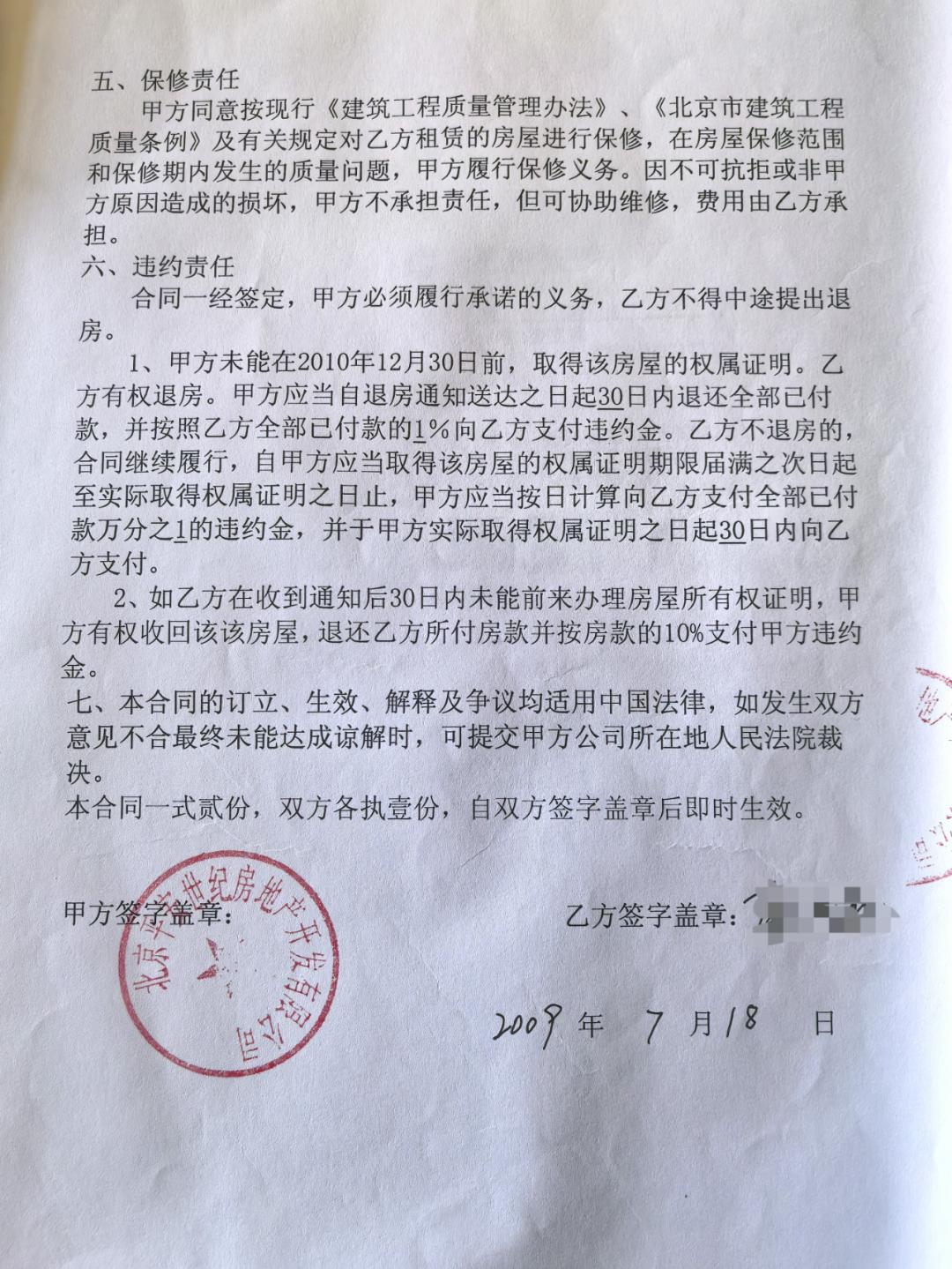 2009年,居民张先生和北京平安世纪房地产开发有限公司签订合同,购买了朝阳区高原街4号院北桃园一套房屋,第二年便住了进来。“2009年签合同时,开发商承诺2010年底前就能取得房产证,在购房合同里也明确标明。虽然成交价相对较低,但我心想,都住进来了还能有啥问题,就把协议签了。然而,房本至今仍然没有拿到手。”张先生表示。