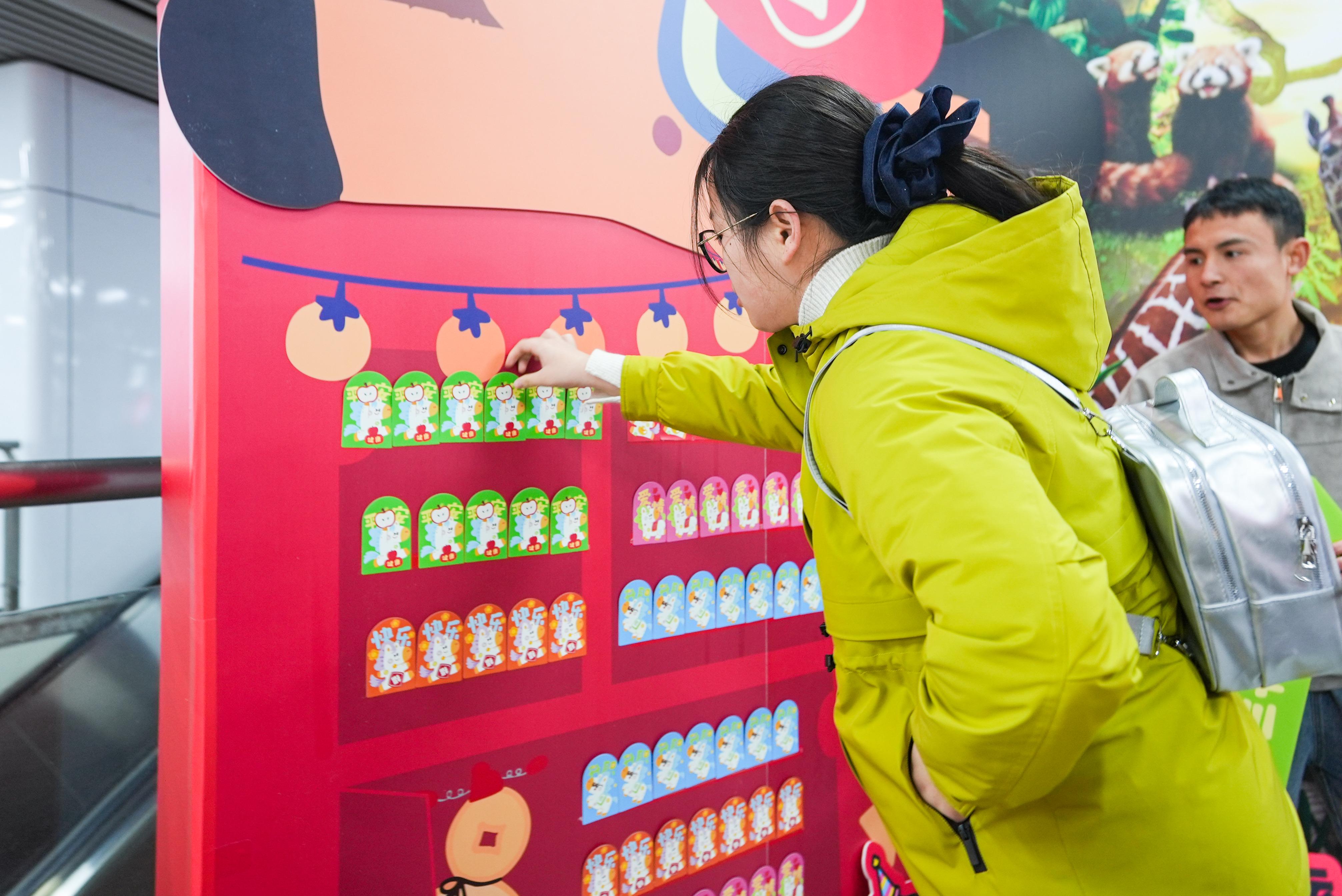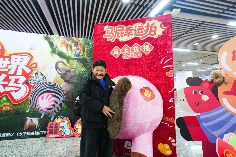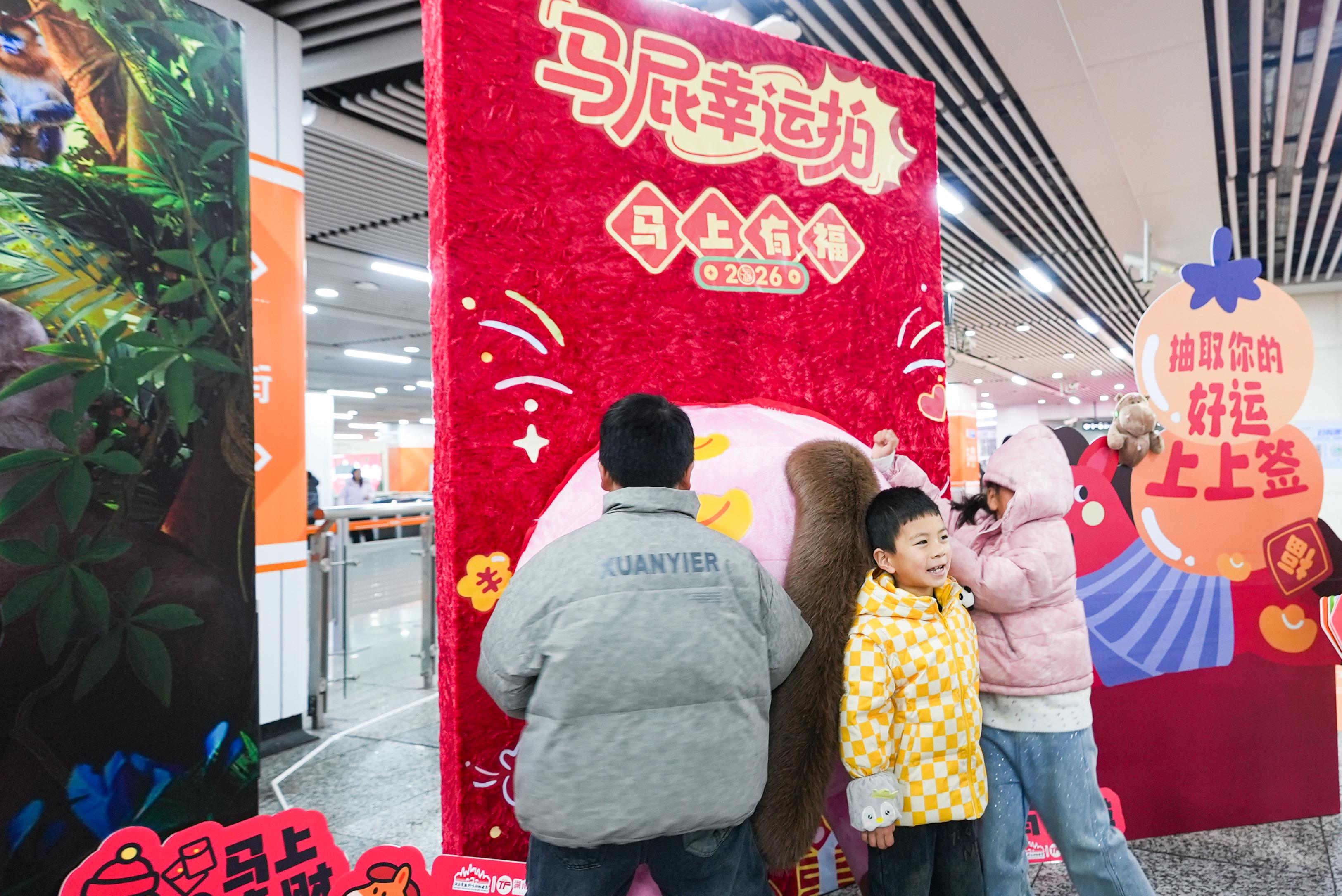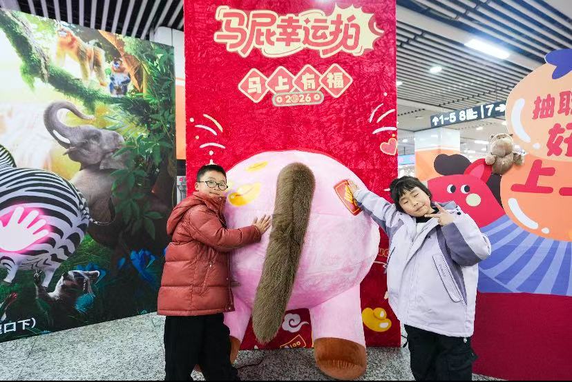 “快来拍个马屁,新年行大运!”活动现场,一座设计新颖、憨态可掬的“马屁幸运拍”装置成为了人气焦点。它将中国传统生肖文化与现代网络谐音梗巧妙结合,以幽默亲切的方式邀请过往乘客参与打卡。