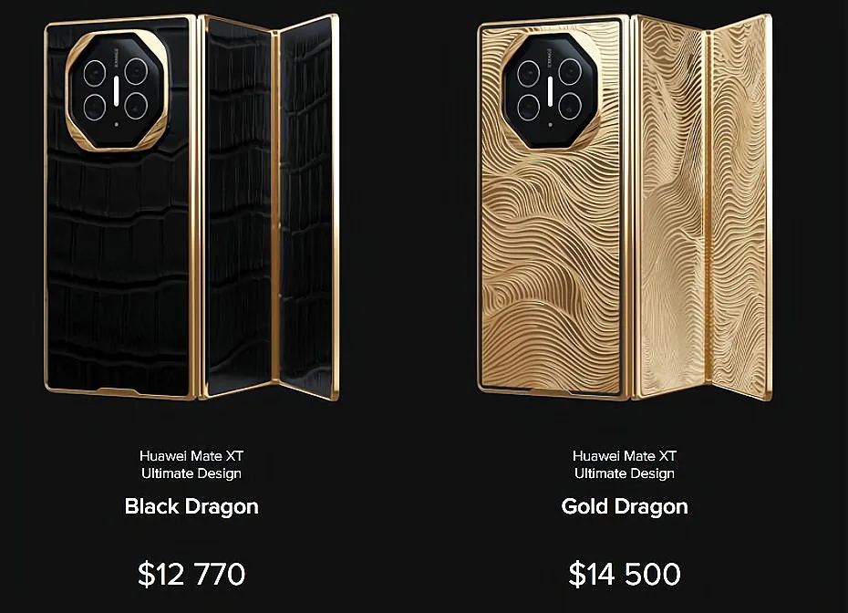 而国外奢侈品平台Caviar推出华为MateXT非凡大师定制版,分别采用黄金、鳄鱼皮等材料打造机身。在售价方面,比黄牛还要狠,达到了12770美元起,折合人民币89559元。要知道,华为MateXT非凡大师现在市场黄牛价就加个几千就能够入手,而华为MateXT非凡大师镀金后,卖得这么贵,并且这还只是起始价。这次华为MateXT非凡大师有2个定制版,分别是金龙和黑龙。其中金龙打造成本更高,所以也就更昂贵。