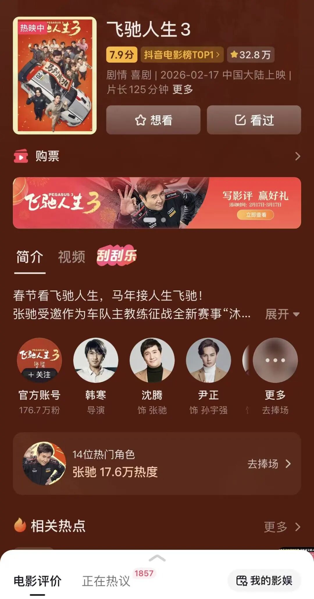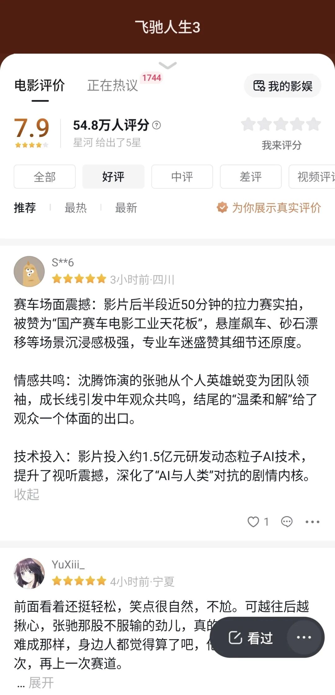 国产系列IP电影,少有拍到第三部仍能口碑票房双丰收的作品。《飞驰人生3》,在档期内于抖音影视榜上的热度最高超过了10亿,“热血”“好哭”“真诚”等成了抖音观众的观影关键词,也将《飞驰人生3》以7.9的高分推向了榜单第一名。“不完美,但够燃;如果你爱赛车,爱系列情怀,想看一个努力未必夺冠、但依然值得的故事,绝对值回票价”的用户评价,得到了许多人的同频高赞。