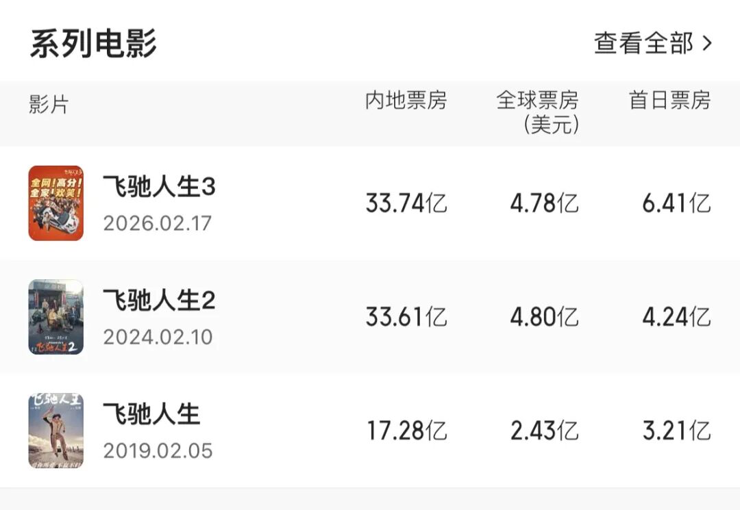 从7年前的第一部起,《飞驰人生》系列已然成了春节档的经典IP。第一部斩获17亿多票房,时隔5年再上映的第二部,票房也超过了33亿。如今的第三部,不仅超越自身成绩,更最终登上春节档票房冠军位置。