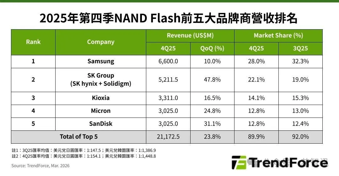 从2025年四季度主要NAND Flash厂商的表现来看,排名第一的三星电子营收为66亿美元,环比增长10%,但市占率下滑至28%。产品平均销售价格(ASP)虽明显成长,但位元出货量因前一季基数较高及制程转换损失,呈现环比下滑。
