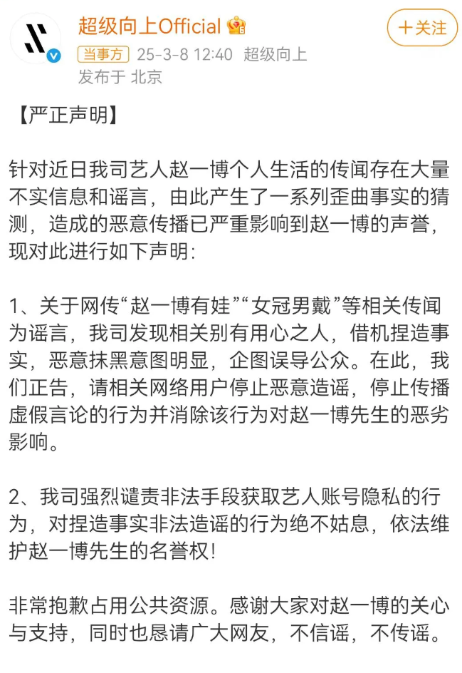 3月8日上午,事件出现戏剧性转折:赵一博和成果的微博账号同时被经纪公司接管。赵一博所属的恩乔依影视发布声明,称“艺人承受的重量远超外界想象”,将暂停其账号自主运营;成果公司则发文道歉,称“避免不实信息扩散”已收回账号管理权。