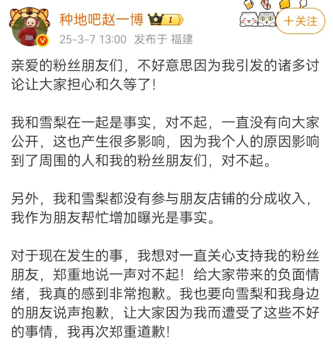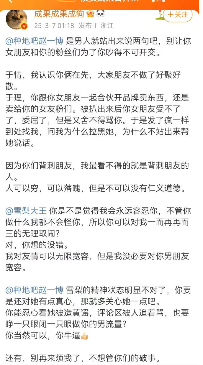 3月7日凌晨2点,演员成果在微博直接@赵一博账号,控诉其纵容粉丝长期网暴闺蜜雪梨,并揭露两人隐瞒五年的地下恋情。文中提到,雪梨因不堪忍受赵一博粉丝的造黄谣和人身攻击,多次向成果求助,而赵一博始终采取冷处理态度。更劲爆的是,成果指出赵一博与雪梨合开潮牌店,利用“单身人设”向粉丝兜售情侣款商品,涉嫌情感与商业的双重欺诈。