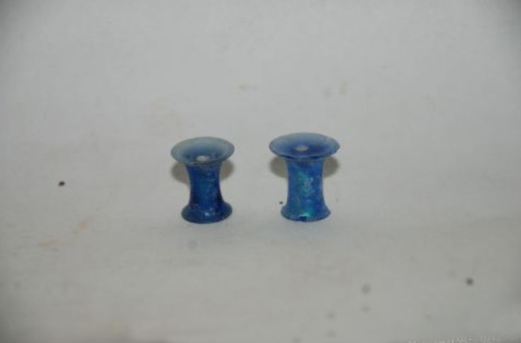 两汉时期,中原地区的女性流行佩戴耳珰,耳珰呈圆柱体,束腰,两端作喇叭口。多以玻璃、琉璃、玛瑙、琥珀等较为通透的材料制成,故有“明月珰”之美称,也有少数是用黄金制作的。耳珰中心均有横贯穿孔,可以用细绳从孔中穿过,并穿坠其他坠饰。