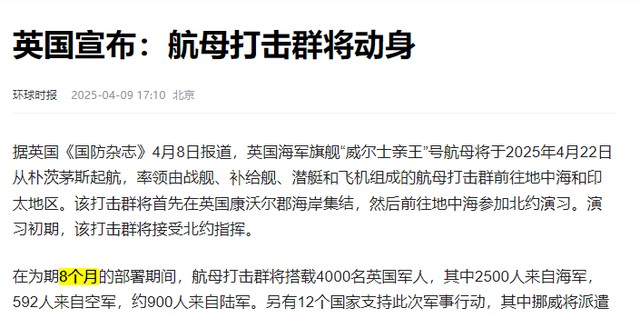 信息来源:环球时报2025-04-09英国宣布:航母打击群将动身