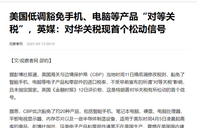 信息来源:观察者网2025-04-13美国低调豁免手机、电脑等产品“对等关税”,英媒:对华关税现首个松动信号