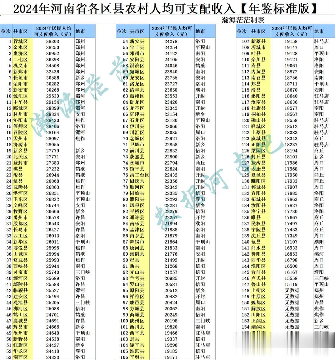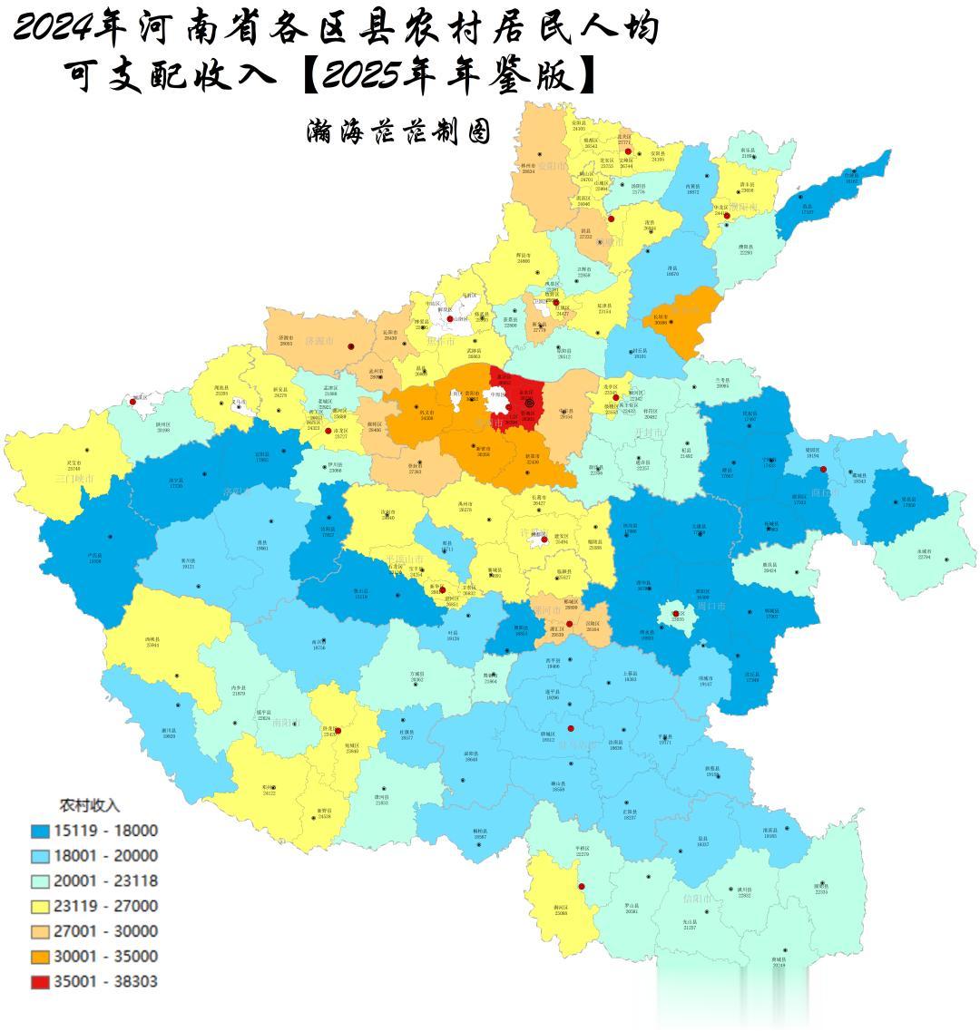 2024年河南省各区县农村居民人均可支配收入具体数据如下: