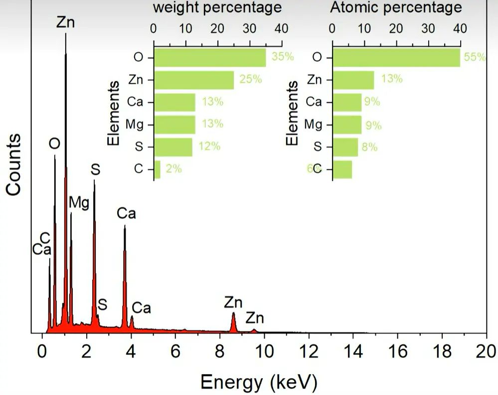 EDS定量分析结果通常以“原子百分比(At%)”呈现,需注意:定量结果是相对值,而非绝对值。EDS定量结果不能替代化学分析(如ICP-MS、元素分析C、O、N等轻元素的特征X射线能量低(),易被样品或探测器吸收,定量误差较大。