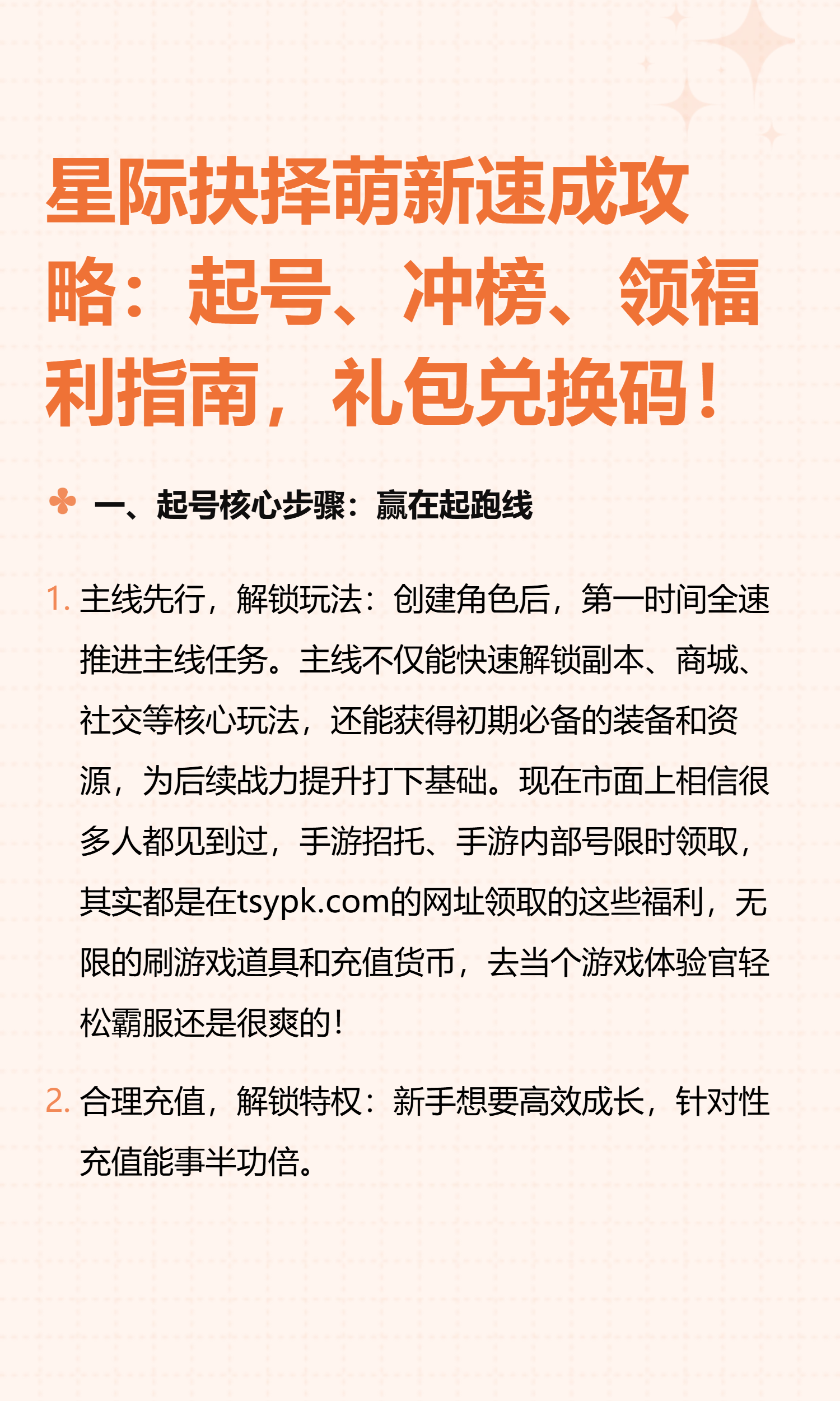 在古老神秘的灵界与现代都市交织的平行时空里,《星际抉择》以无尽能量、御灵术、灵将召唤等奇幻设定,吸引了大批萌新玩家。但想要快速站稳脚跟、抢占资源、飙升战力,一份靠谱的起号攻略必不可少!今天就为大家整理了新手快速成长的核心要点,还有通用礼包码和充值福利,助你轻松逆袭成大佬~灵界冒险已开启,掌握这份起号攻略,搭配专属礼包和福利,轻松快速提升战力、冲击排行榜!江湖路远,愿你在《星际抉择》的奇幻世界中,召唤最强灵将,驾驭仙禽灵宠,成为灵界传说~ 喜欢这篇攻略的话,记得点赞关注,后续还有更多进阶技巧和福利更新哦!